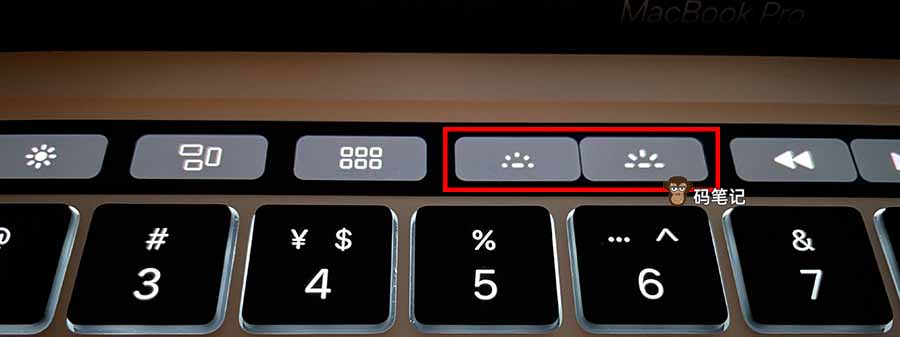 Mac笔记本键盘灯不亮,码笔记认为最简单的解决方法就是调节背光灯,但是带Touch Bar的MacBook大家不容易找到键盘灯亮度调节,方法如下: