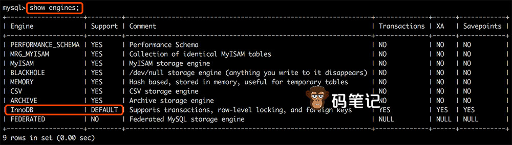 MySQL的存储引擎有多种,以Innodb引擎和MyISAM引擎最为常见,码笔记分享MySQL查看存储引擎的方法,一条命令即可搞定: