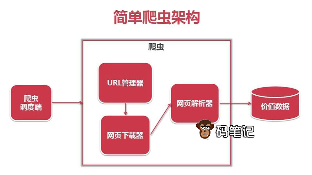 Python爬虫主要是由5部分组成,即调度器、URL管理器、网页下载器、网页解析器、应用程序(应用程序用来爬取有价值数据),码笔记来详细介绍这5个组成部分的作用: