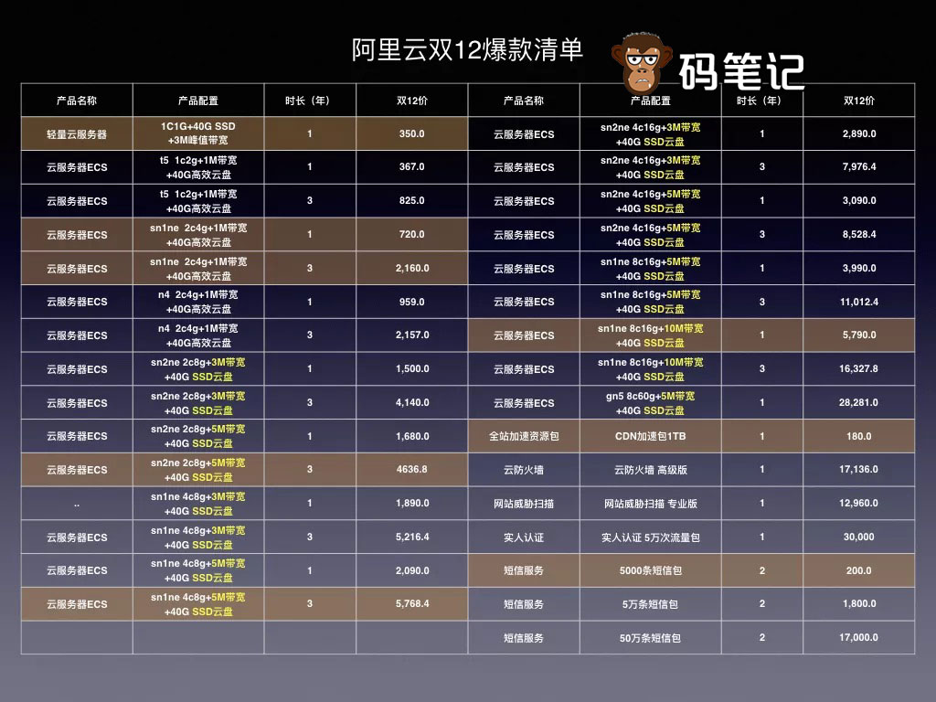 阿里云双12优惠狂欢节如期而至,双十一没来得及购买的用户可以赶上阿里云双12这波优惠,码笔记分享:云服务器优惠价格爆款清单已经新鲜出炉,大家参考一下,有合适的可以下手了: