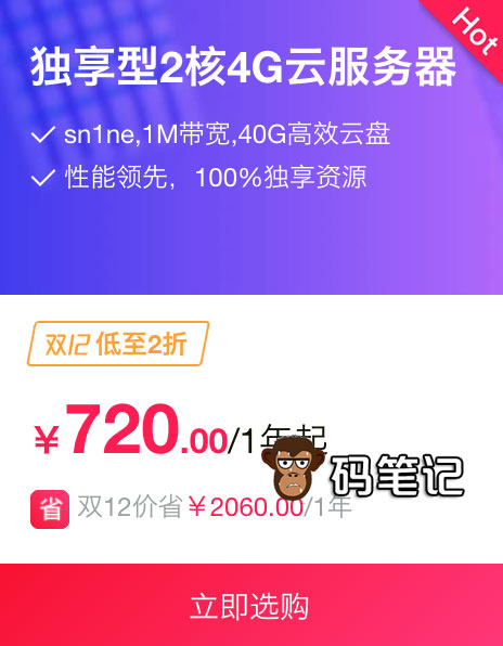 码笔记想要购买一台云服务器用来学习Linux,配置选择2核4G的,由于没什么流量,所以1M的宽带也是可以接受的,重点码笔记需要一台香港地域的云服务器,因为我的域名没有备案,看到阿里云双12有一款比较合适的云服务器,是独享型sn1ne实例(非突发性能t5实例),价格是720元/年,可选香港节点,好吧就是你了: