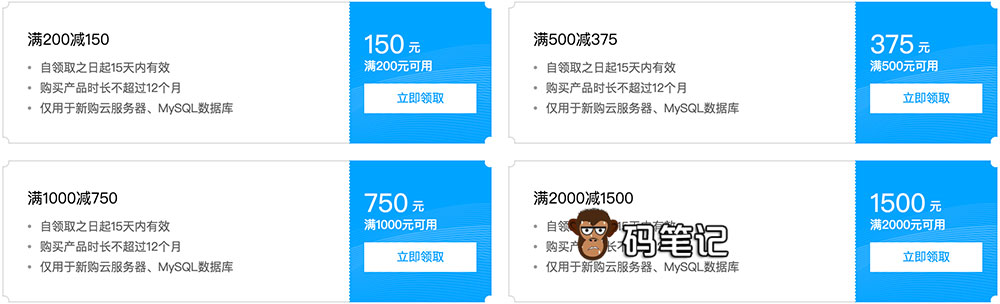 码笔记在腾讯云购买了一台学生服务器,发现腾讯云有个新客代金券,一共是3785元,注册新用户就可以领取,代金券很划算可以省不少银子,代金券可以用于购买云服务器和云数据库,码笔记分享: