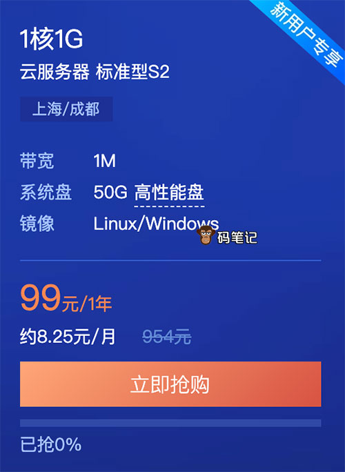 腾讯云服务器秒杀优惠活动,云服务器1核1G只要99元一年,可领代金券,码笔记分享腾讯云99元服务器秒杀优惠: