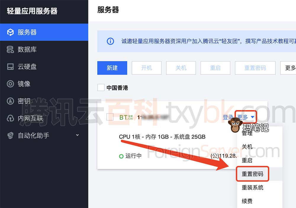 购买轻量应用服务器的时候并没有设置密码,轻量服务器创建后,想要登录到云服务器,必须先重置密码,然后使用新密码登录到云服务器上。登录到轻量应用服务器管理控制台,在服务器列表中找到刚刚购买的轻量服务器,点“更多”--“重置密码”,如下图: