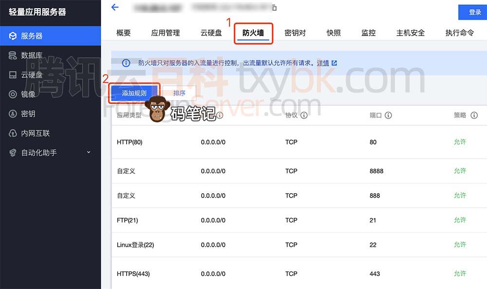 2、切换到轻量服务器的“防火墙”页面,点击“添加规则”如下图: