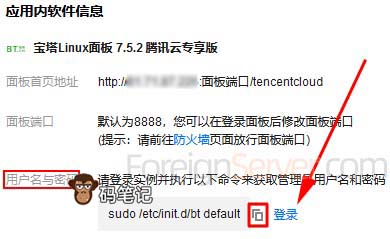 3、在打开的登录窗口中,粘贴刚刚复制的命令:sudo /etc/init.d/bt default 并回车执行命令,返回结果即可看到宝塔外网面板地址、username和password,如下图: