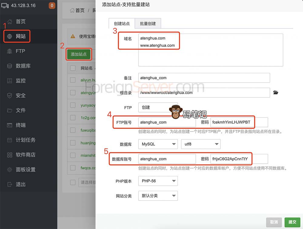 然后点“提交”,即可完成创建站点,保存好FTP和数据库账号密码。