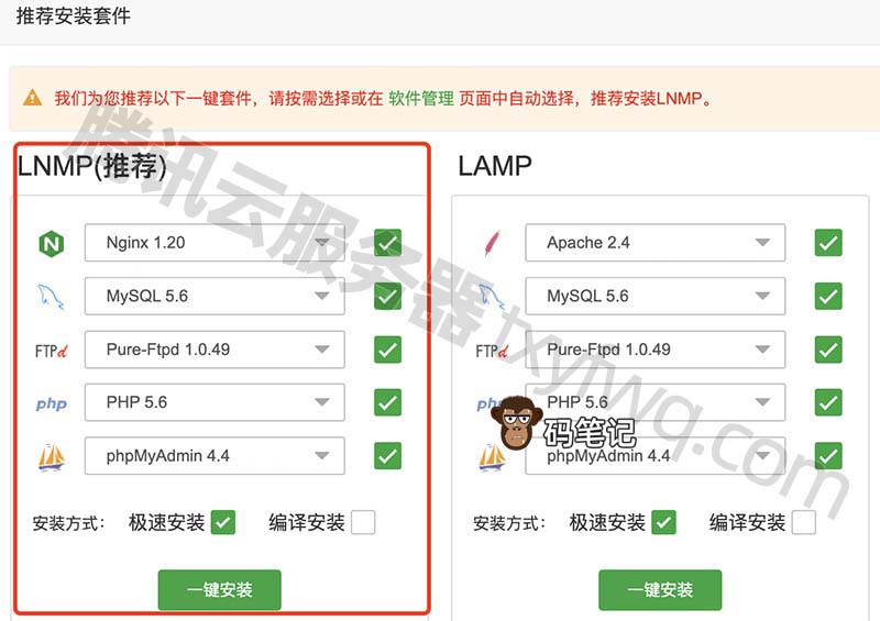 1、第一次登录宝塔面板,会提示推荐安装套件,本文腾讯云百科要搭建WordPress博客,选择LNMP(推荐),如下图: