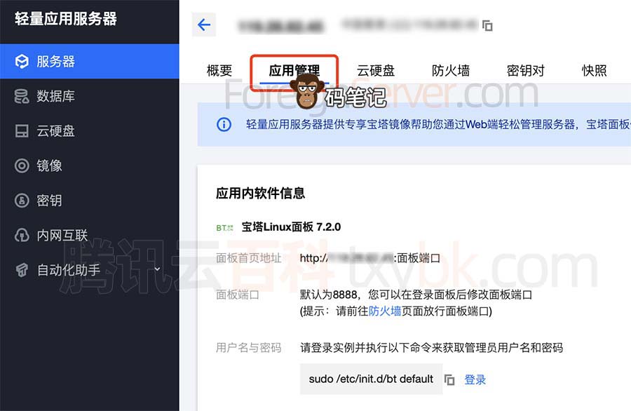 本文码笔记使用腾讯云轻量服务器安装宝塔面板,包括轻量服务器配置选择、宝塔面板镜像选择、防火墙开宝塔面板端口及查看宝塔面板地址、用户名与密码详细流程: