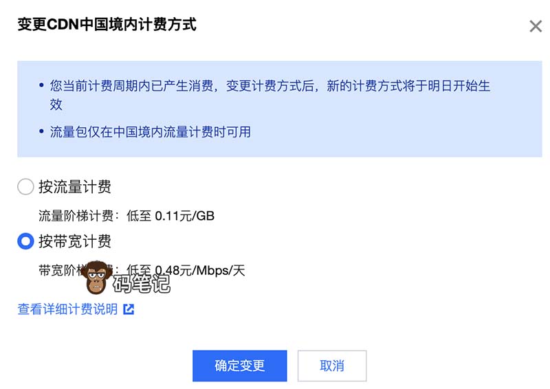 码笔记以中国大陆地域的CDN加速为例,大家可以参考下表中国大陆地域CDN加速按流量和按带宽计费价格表: