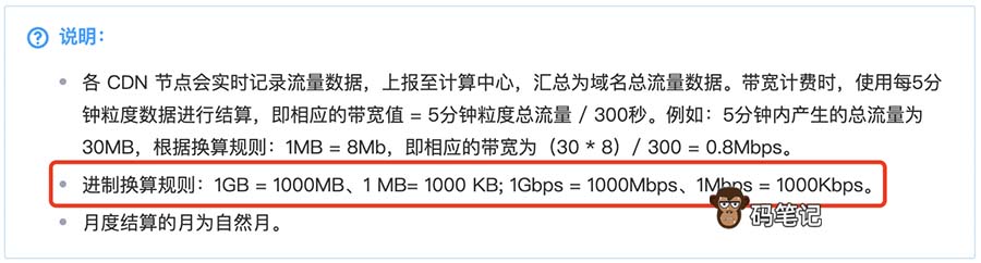 注意:这里面1TB是按照1000GB算的,为什么不是1024GB?码笔记也不清楚,在腾讯云官方文档(CDN计费说明)中有注明,如下图: