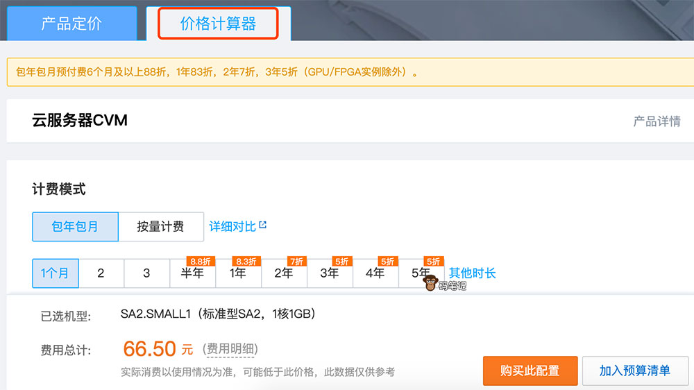 腾讯云服务器价格计算器,选择计费模式、购买时长、地域节点、云服务器配置规格、系统盘及公网宽带即可一键计算出云服务器总价,地址如下: