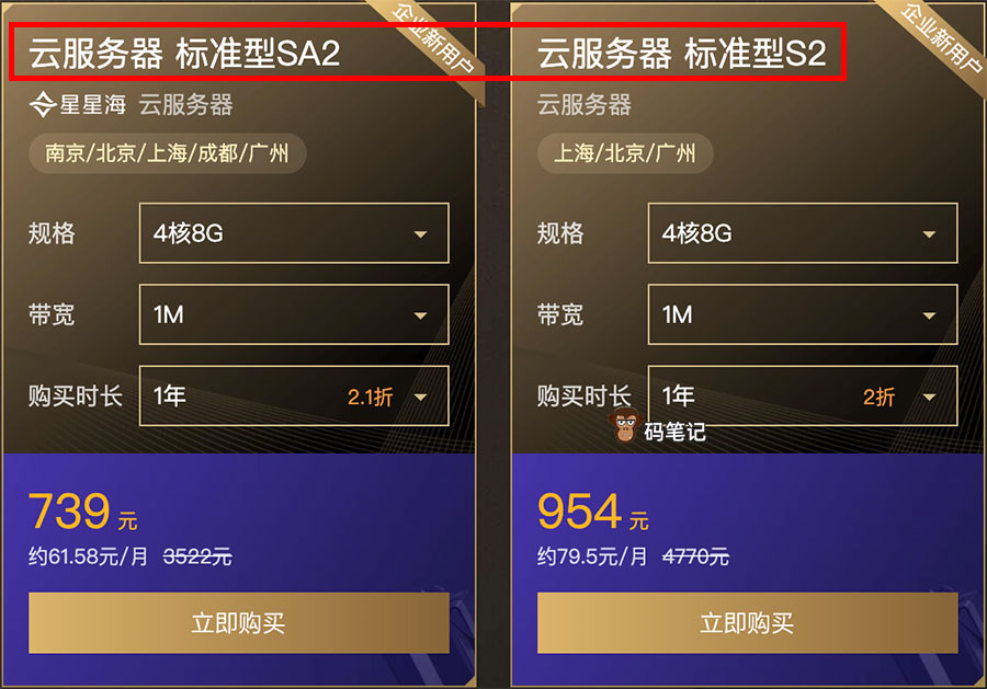 码笔记发现腾讯云服务器同CPU内存配置下,标准型SA2实例价格更便宜,最终码笔记选择了腾讯云标准型SA2云服务器;当然如果喜欢Intel处理器的用户可以选择标准型S2实例。