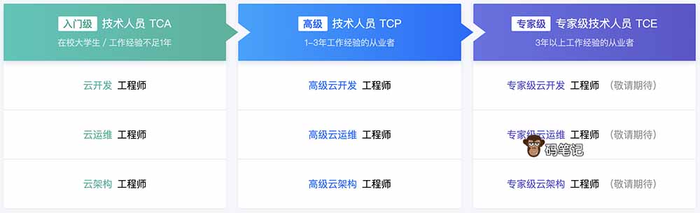 腾讯云认证体系TCA、TCP和TCE上线,还有腾讯云专项技术认证考试等,考完阿里云ACP认证要不要考一下腾讯云认证,码笔记来详细说下腾讯云认证体系等级及其他专项技术认证考试: