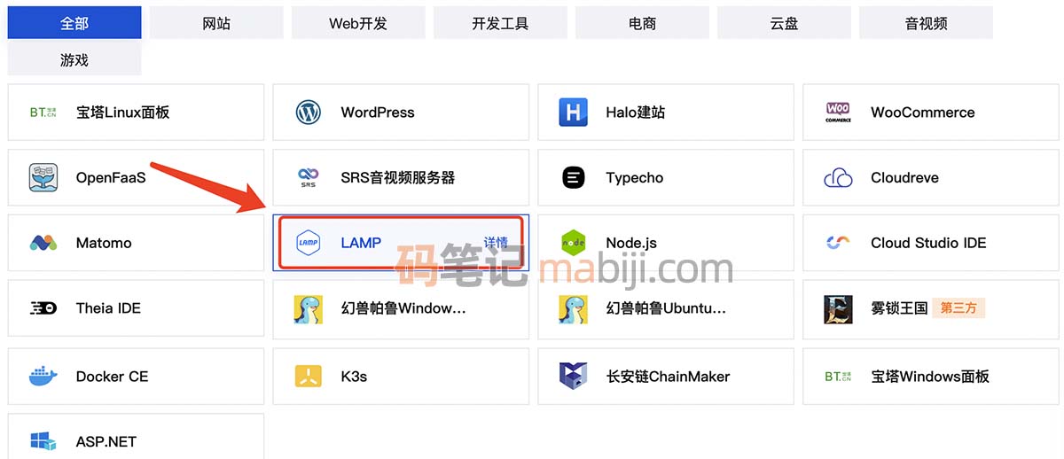 使用腾讯云轻量应用服务器安装LAMP环境很简单,应用模板直接选择“LAMP”镜像即可,打开腾讯云轻量应用服务器页面 mabiji.com/go/lighthouse 在应用模板中选择LAMP即可,如下图:
