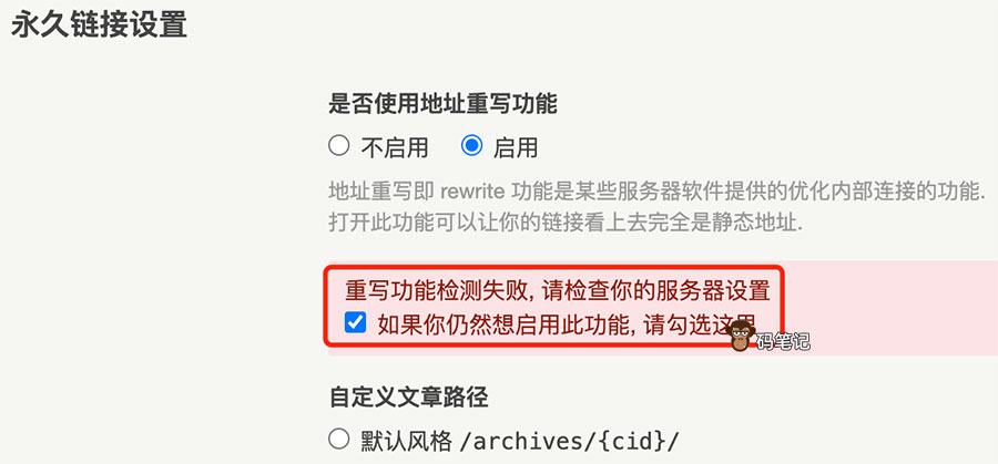 Typecho永久链接设置提示“重写功能检测失败, 请检查你的服务器设置”如何解决?这是由于Typecho程序检查了你的服务器伪静态设置,可能是因为没设置好伪静态规则就直接开启地址重写功能,可能会导致网站内页404错误,码笔记分享解决Typecho重写功能检测失败, 请检查你的服务器设置的方法: