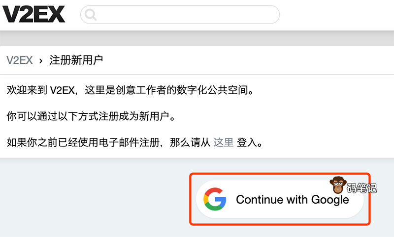 目前V2EX仅支持Google注册,即Continue with Google,如下图: