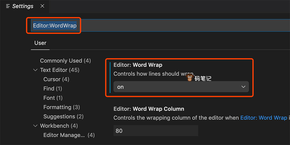 码笔记以Mac下的VSCode为例,修改Editor:WordWrap选项即可,默认Editor:WordWrap为off关闭状态,改成on开启即可。