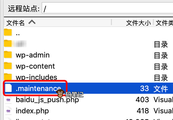 码笔记分享解决方法:WordPress在升级是会在网站根目录下生成一个名为.maintenance的文件,把这个文件删除,网站即可正常打开,如下图所示: